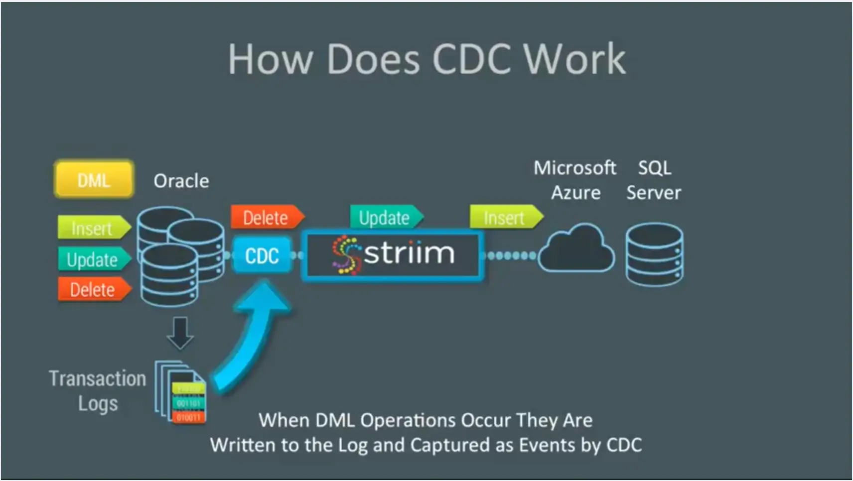 Striim provides change data capture as a collector out of the box. This enables real-time collection of change data from Oracle SQL Server and MySQL. CDC works because databases write all the operations that occur into transaction logs. Change data capture listens to those transaction marks, instead of using triggers or timestamps, and directly reads these logs to collect operations. This means that every DML operation – every insert, update, and delete – is written to the logs captured by change data capture and turned into events by our platform.