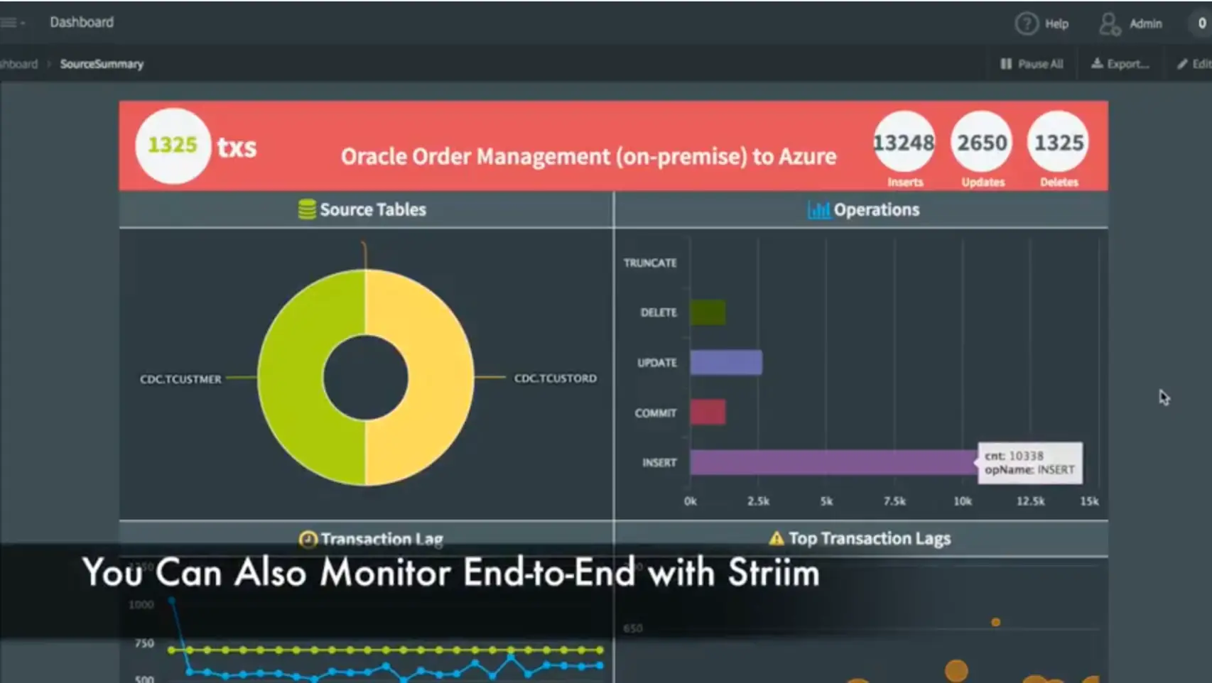 In addition to the data movement, we’ve also built a monitoring application complete with dashboard that shows data flowing through the various tables, the types of operations occurring, and the entire end-to-end transaction lag. This shows the difference between when a transaction was committed on the source system, and when it was captured and applied to the target. You can also see some of the most recent transactions.