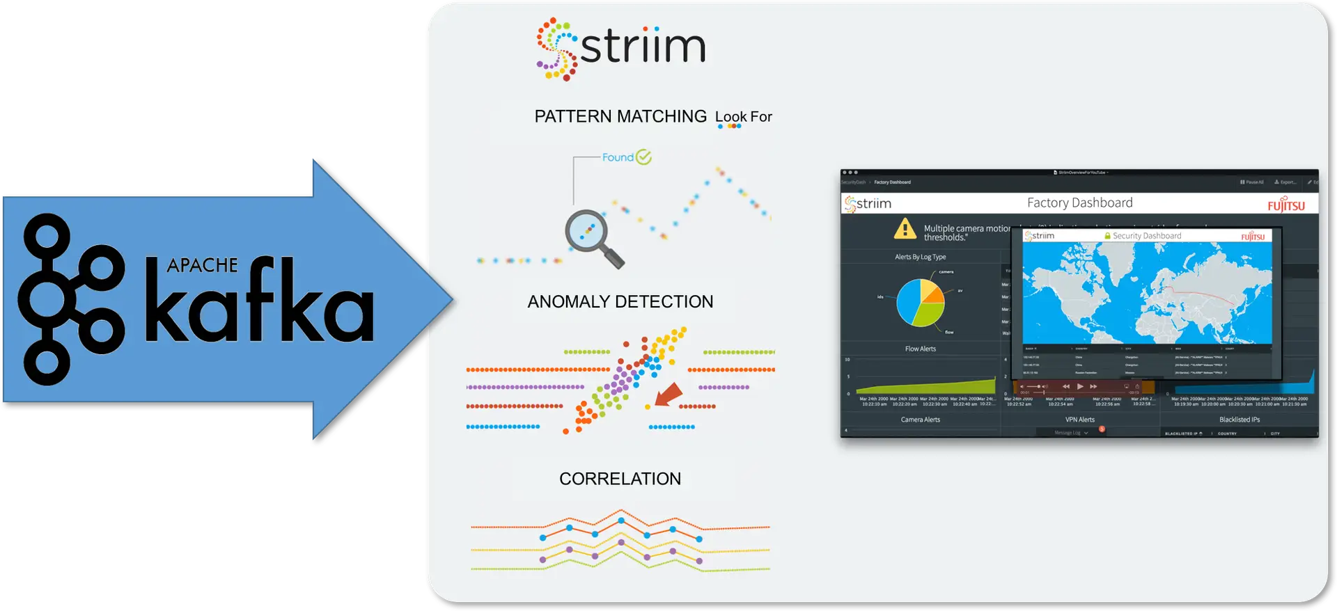 And this enables you to look for things that happen at the same point of time or within the rate, the time range and also to look things I co located in, in the same geographic location for example. So doing this correlation is an important aspect of almost all of the analytics use cases that we see. Then on top of all of this processing, as I mentioned, is happening through the sequel based queries. You can then build visualizations all using our platform. So real time dashboards, you can trigger a workflows, you can generate alerts to notify people that things are happening and we have ways of integrating third party machine learning directly into the streaming data flows as well for realtime scoring and inference. That’s basically what the platform does. It’s uh, in memory streaming integration on analytics platforms, it’s everything from continuous data collection, processing, analytics and delivery.