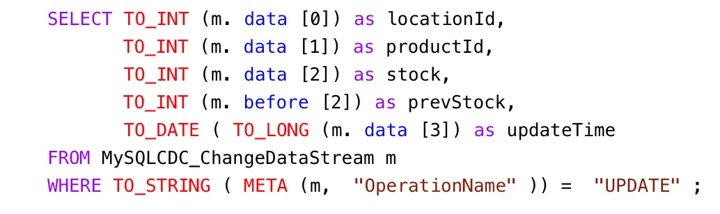 But we want only certain data, and to restrict things to updates. When selecting the data we want, we can apply transformations to convert data types, access metadata, and many other data manipulation functions. This is the query we will use to process the incoming data stream:
