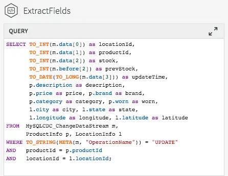 The final step is to join the data in the caches with the real-time data coming from the MySQL CDC stream. This can be achieved by modifying the ExtractFields query we wrote earlier.