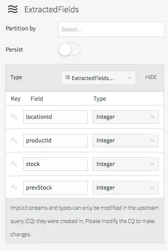 We are also using the metadata extraction function (META) to obtain the operation name from the metadata section of the stream, and a number of type conversion functions (TO_INT for example) to force data to be of the correct data types. The date is actually being converted from a LONG timestamp representing milliseconds since the EPOCH.