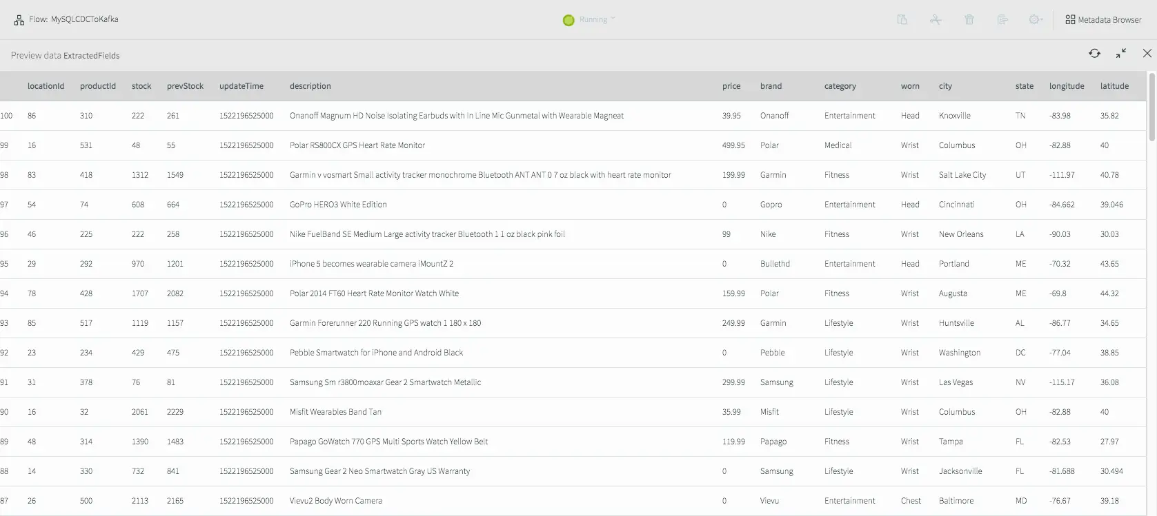 If we deploy and start the application, then preview the data on the stream prior to writing to Kafka we will see the fully-enriched records.
