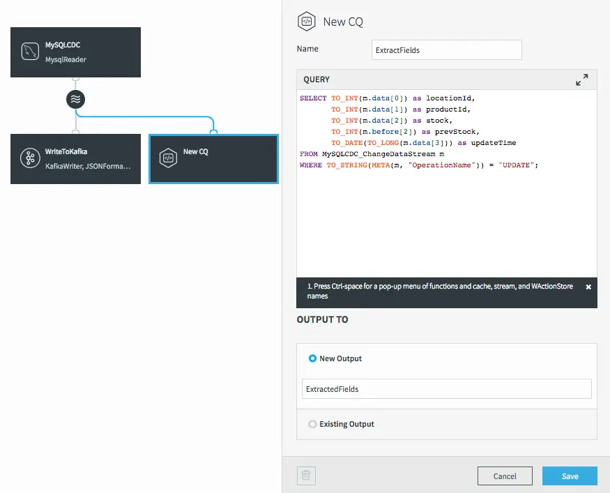 The final step before we can save this CQ is to choose an output stream. In this case we want a new stream, so we’ll call it “ExtractedFields”.