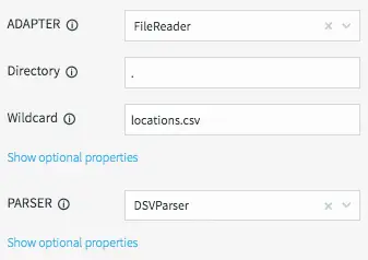 We will be reading data from the “locations.csv” file present in the product install directory “.” using the DSVParser. This parser handles all kinds of delimited files. The default is to read comma-delimited files (with optional header and quoted values), so we can keep the default properties.