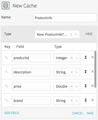 All caches need a name, data type, lookup key, and can optionally be refreshed periodically. We’ll call the product information cache “ProductInfo,” and create a data type to match the MySQL PRODUCT table, which contains details of each product in our CDC stream. This is define in MySQL as: