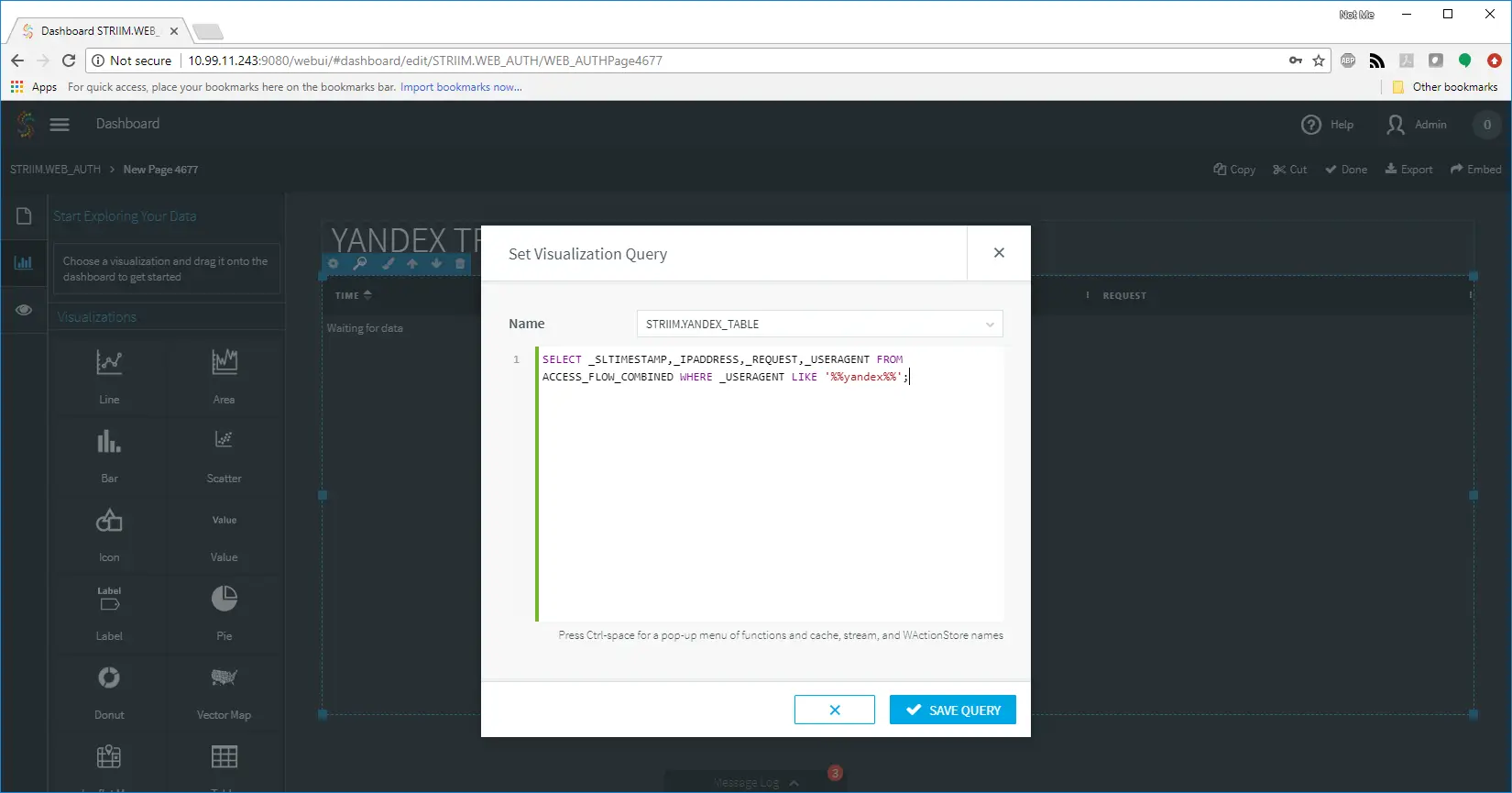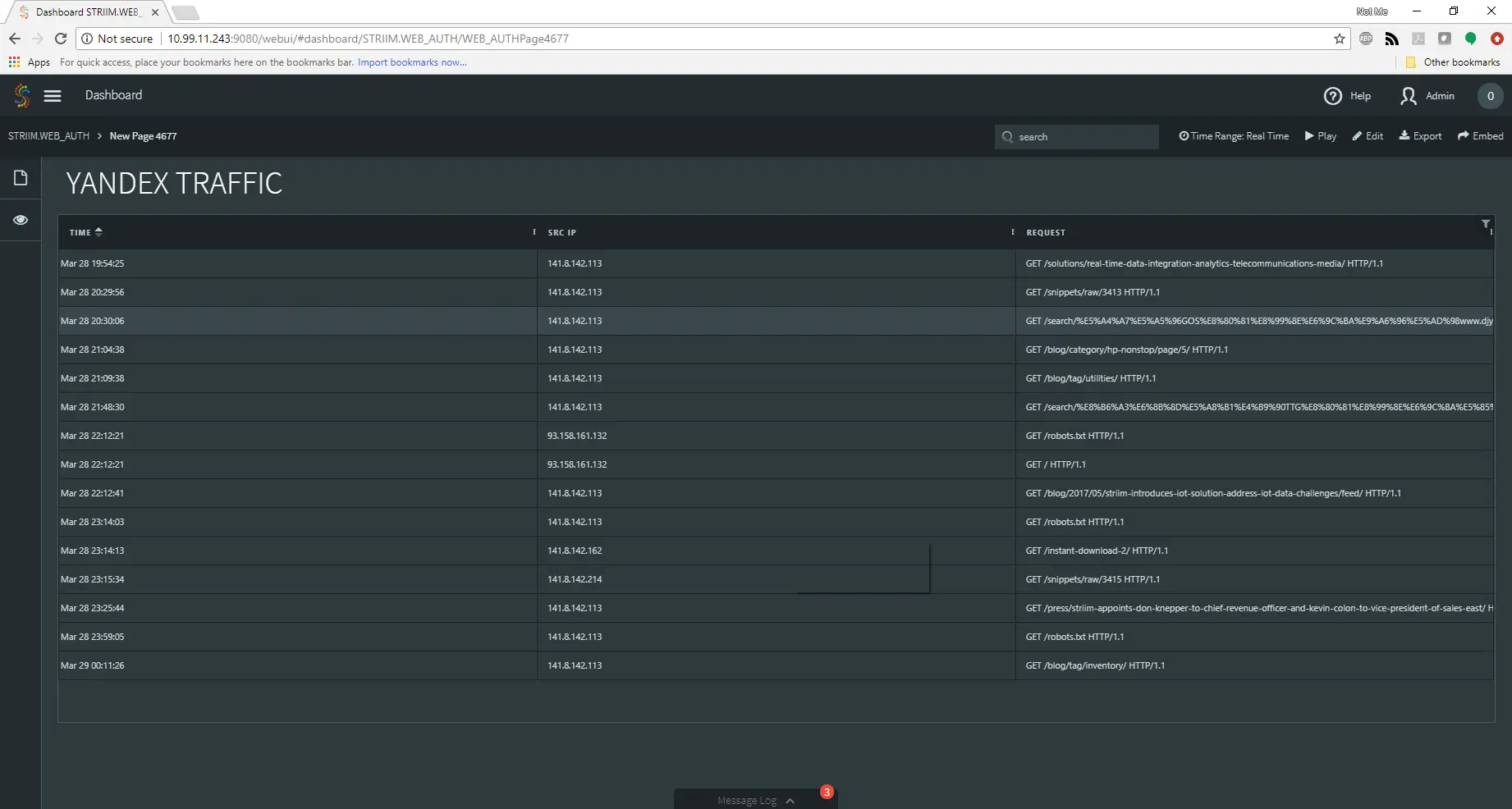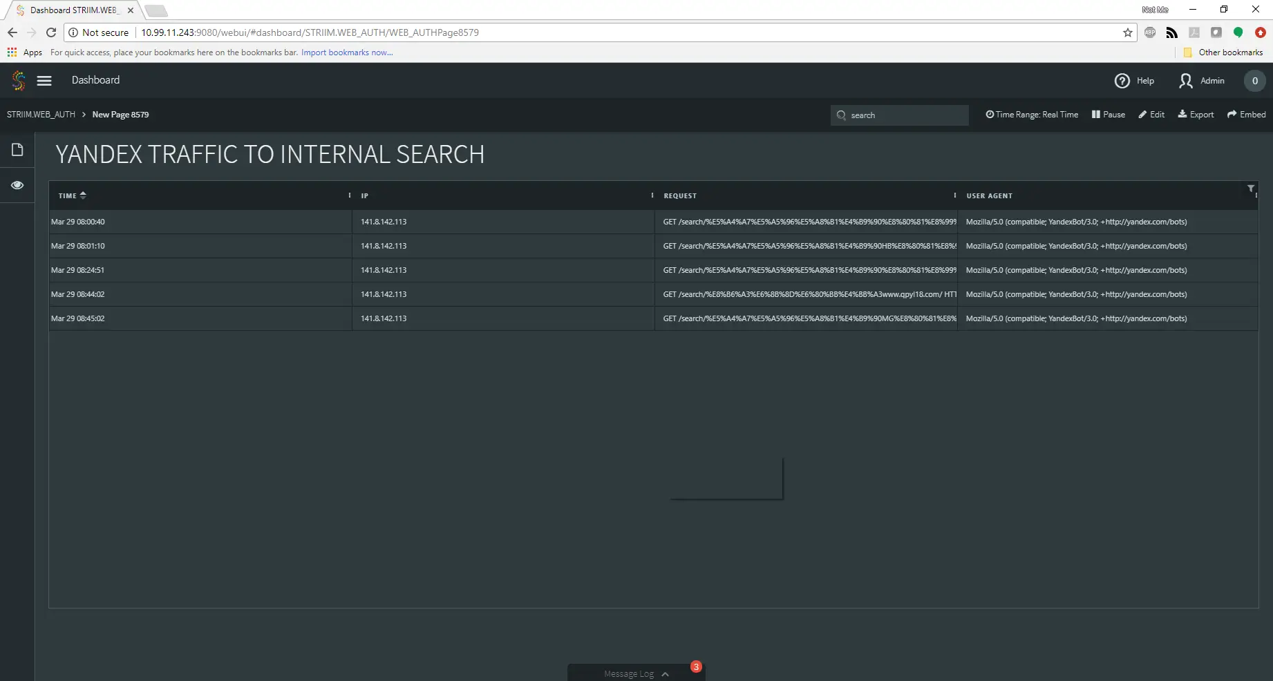 From there, I next created a dashboard to show me just the information related to the web requests from Yandex. This would give me a clean and up-to-date view of the data I needed in real time. A quick TQL query combined with a table and I was on my way!