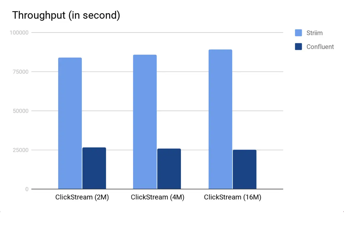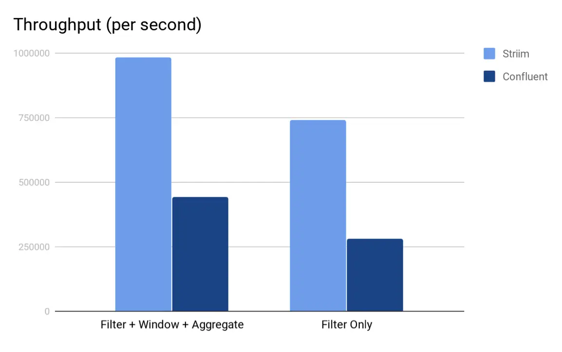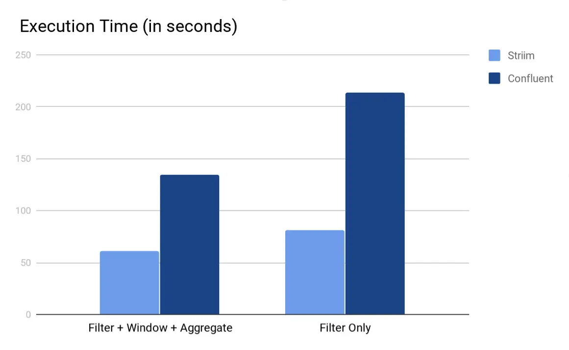 As we can see from both the charts, Striim’s TQL beat KSQL in both the scenarios by a multiple of 3. Again, we believe that the main reason why Striim outperforms KSQL is because in Striim, the entire computation pipeline can be run in-memory whereas for KSQL, the output of every KSQL query is either a stream or a table which are backed by (disk-based) Kafka topics. Also, since the input Kafka topic is partitioned, Striim was able to employ auto-parallelism and use multiple cores to read from Kafka, perform the query and write to the output Kafka topic.