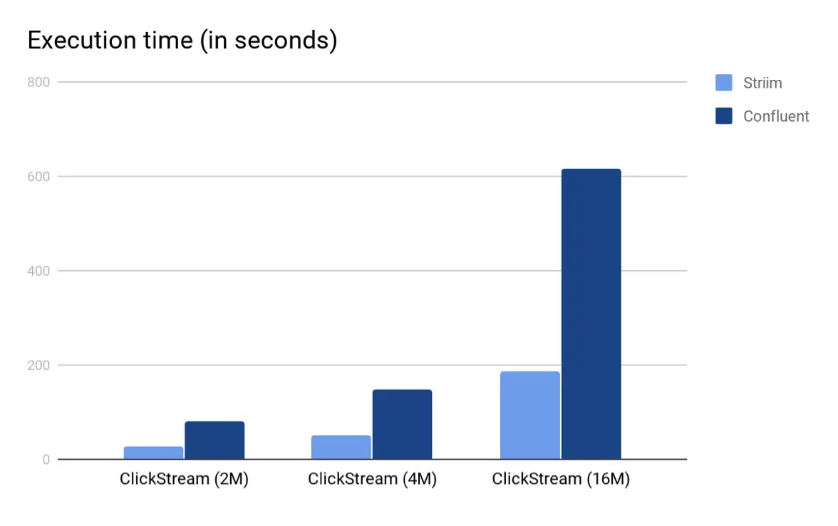 The following are the total execution times and average event throughput for both the platforms. We used Striim 3.7.4 and KSQL 0.4 (released December 2017) for the experiments.
