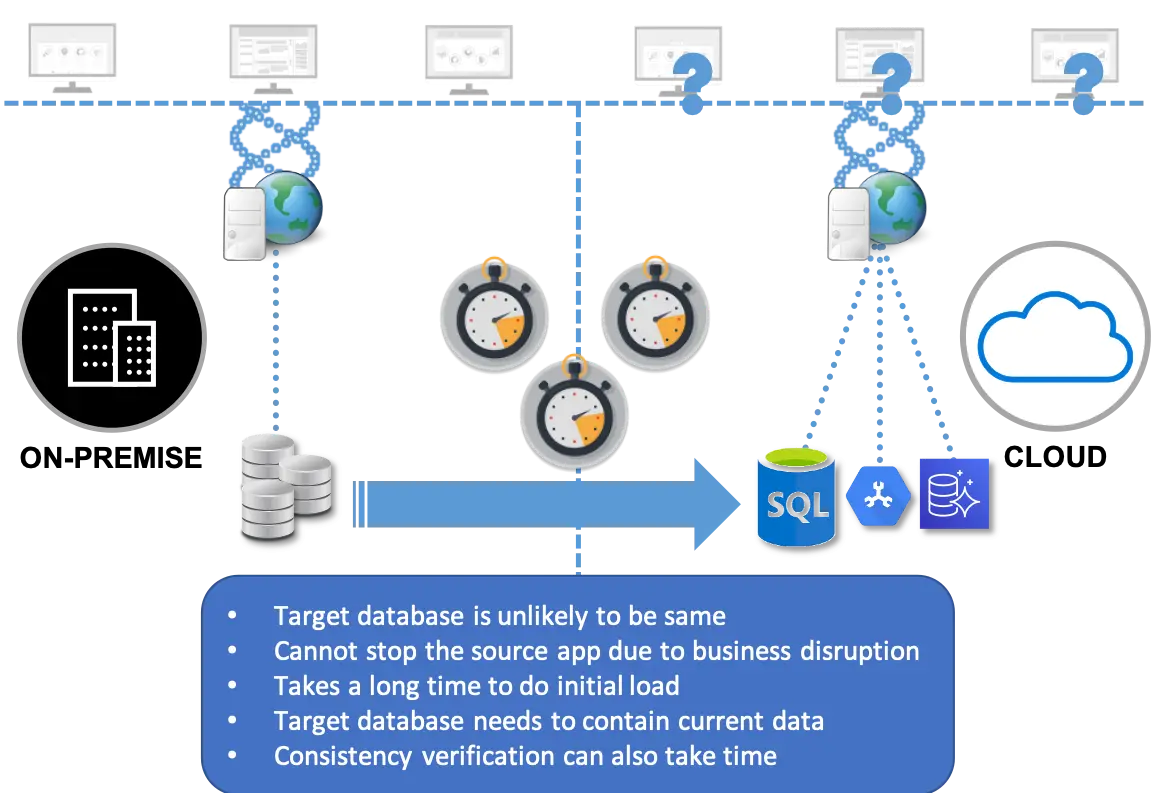 Data loss: Some data migration tools might lose or corrupt data in transit because of a process failure or network outage. Or they may fail to apply the data to the target system in the right transactional order. As a result, your cloud database ends up diverging from the legacy system, also negatively impacting your business operations.