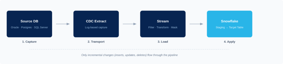 For Snowflake users, this is a game-changer. Snowflake excels at scale, complex transformations, and powering AI/ML models. But those workloads rely entirely on fresh, accurate data. By continuously trickling changes into Snowflake via CDC, your data warehouse stays perfectly synced with your operational databases (like PostgreSQL, Oracle, or SQL Server) in near real-time, without placing heavy query loads on the source systems.
