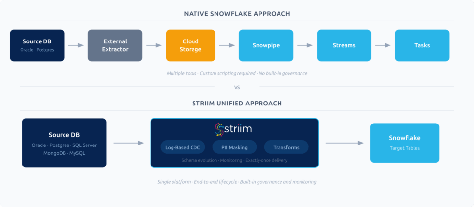 Once the data is captured, how does it get processed and merged into Snowflake? You face an architectural choice between relying on Snowflake’s native toolset or adopting an external, unified CDC platform.