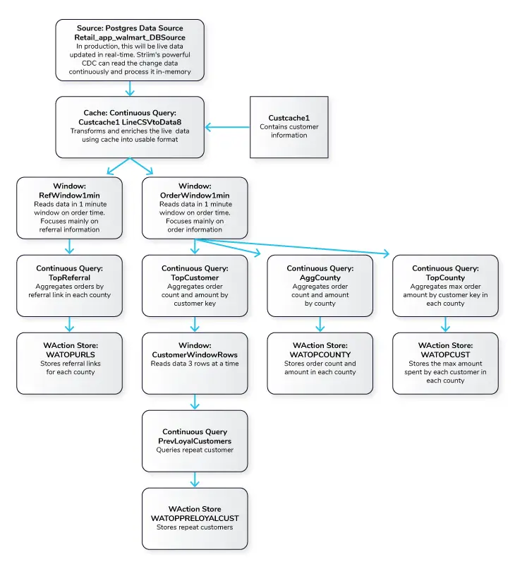 The Retail app in this recipe reads data from PostgreSQL Database and processes it into a usable format. The data is enriched using a cache containing customer details and then transformed using Continuous Queries. The transformed data is streamed with a one-minute window on order time which is further processed and stored in WActionStores. The data from the WAction component is used to populate a dashboard that shows top spenders, referrals and counties. In the production environment, data will be continuously updated on the source database which could be read with Striim’s Change Data Capture for real-time insights.