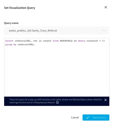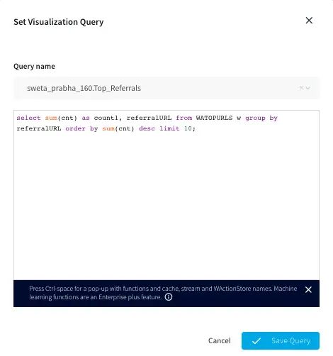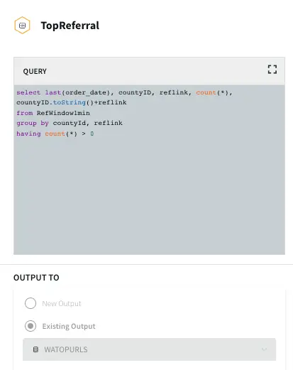 Top Referral links: The CQ counts the number of orders placed through various referral links in each county. The aggregated data is then stored in a WAction store which will be used in the Striim dashboard.