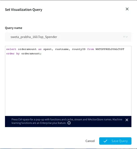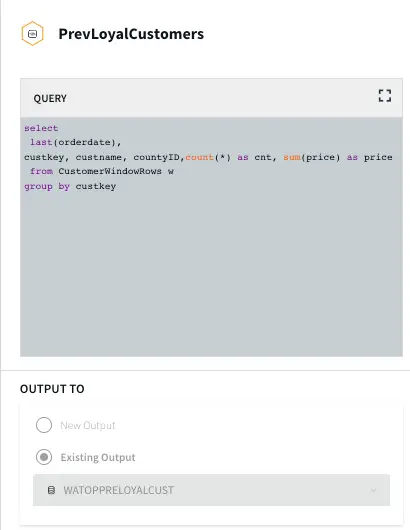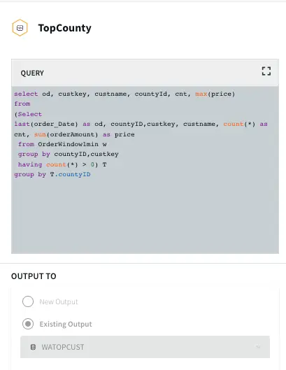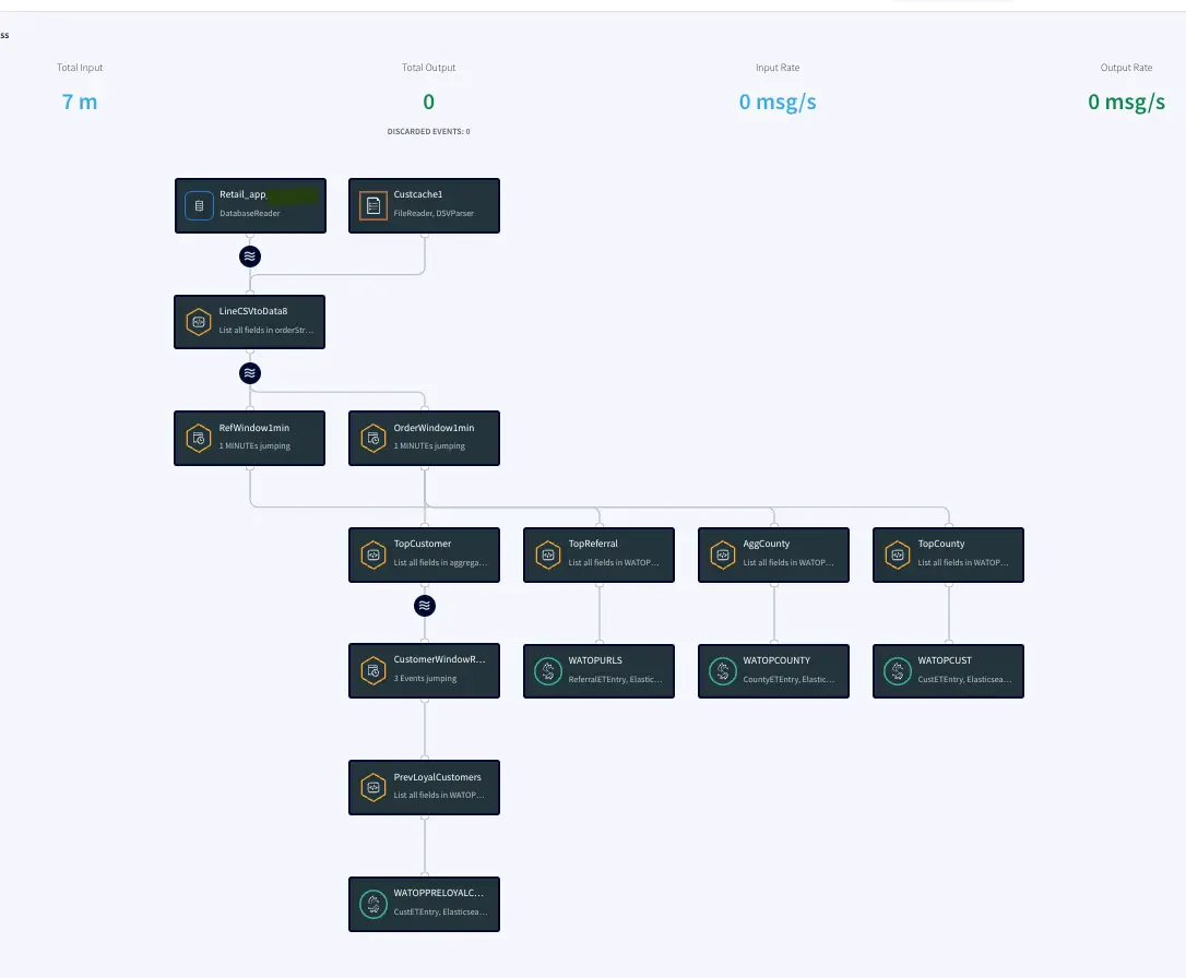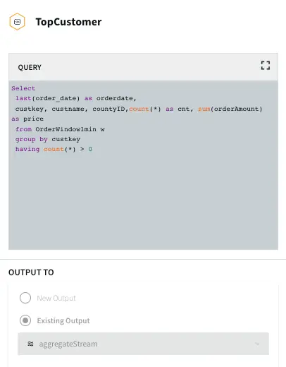 Top Customer: In this app, the order count and order amount of each customer is queried which is then partitioned to 3 events window with partition on customer key. The total order amount by each customer in a 3 event window is calculated. The data is then stored in WAction to analyze the top loyal customers with repeat orders.