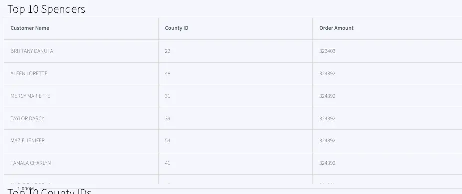 The Top 10 Spender table shows the county id, customer name and order amount of customers with the highest order amount. The data is pulled from WATOPPRELOYALCUST WAction store and ordered by orderamount.