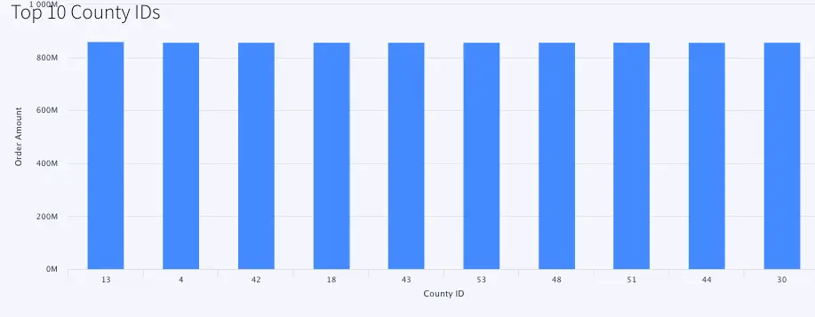 This is a bar chart that reads data from WATOPCOUNTY and orders by amount sold in each county.The top 10 county ids with total order amount are shown in the bar chart.