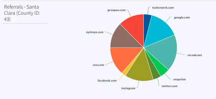 This pie chart shows the referral links for order counts sold in Santa Clara county (County id: 43). Most orders were placed through google.com, instagram and recode.net.