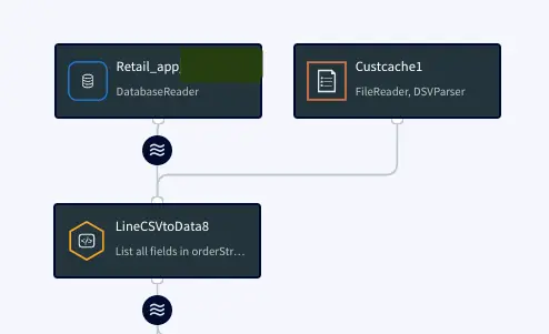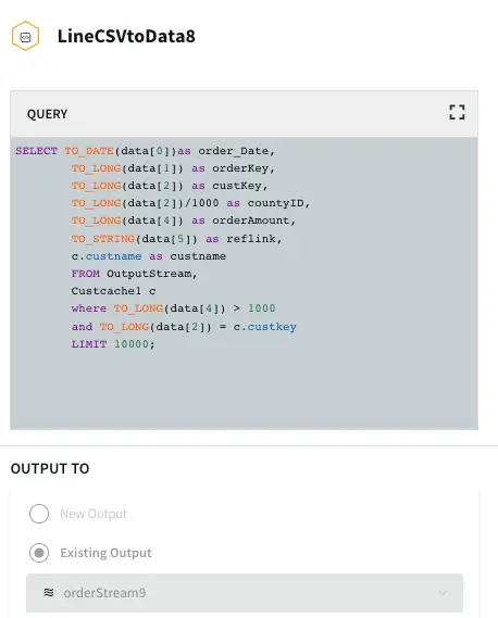 Initial Data Processing and Enrichment: The Continuous Query, LineCSVtoData8 is used to change the datatype for each field in usable format and merge the customer name from cache.