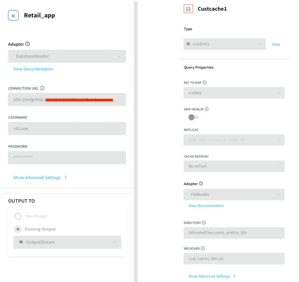 Postgres Source and csv cache: We specify the endpoints, username and password of the source Postgres database. The Cache will cache a dataset in Striim Cloud so it can be joined with a Stream using SQL.