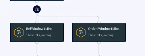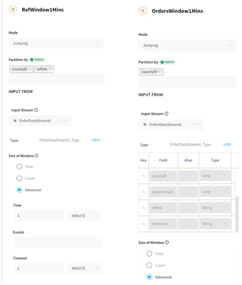 The processed data stream is split into one-minute chunks. The Window component in Striim creates a bounded dataset by a specified number of events, a period of time, or both. In this recipe, the incoming steam contains order data. There are two window components as shown below. Both the windows have jumping mode which means data is periodically updated for 1 minute interval. For RefWindow1Mins window, we have partitioned the datastream by reference link for every county. The partition by option on a time based window starts the timer separately for each. field value. The OrdersWindow1Mins partitions the data stream on countyID.