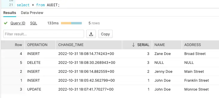 Create an ADDRESS table with the same column names and data types as your source table and AUDIT table with additional columns for operation and timestamp on snowflake.