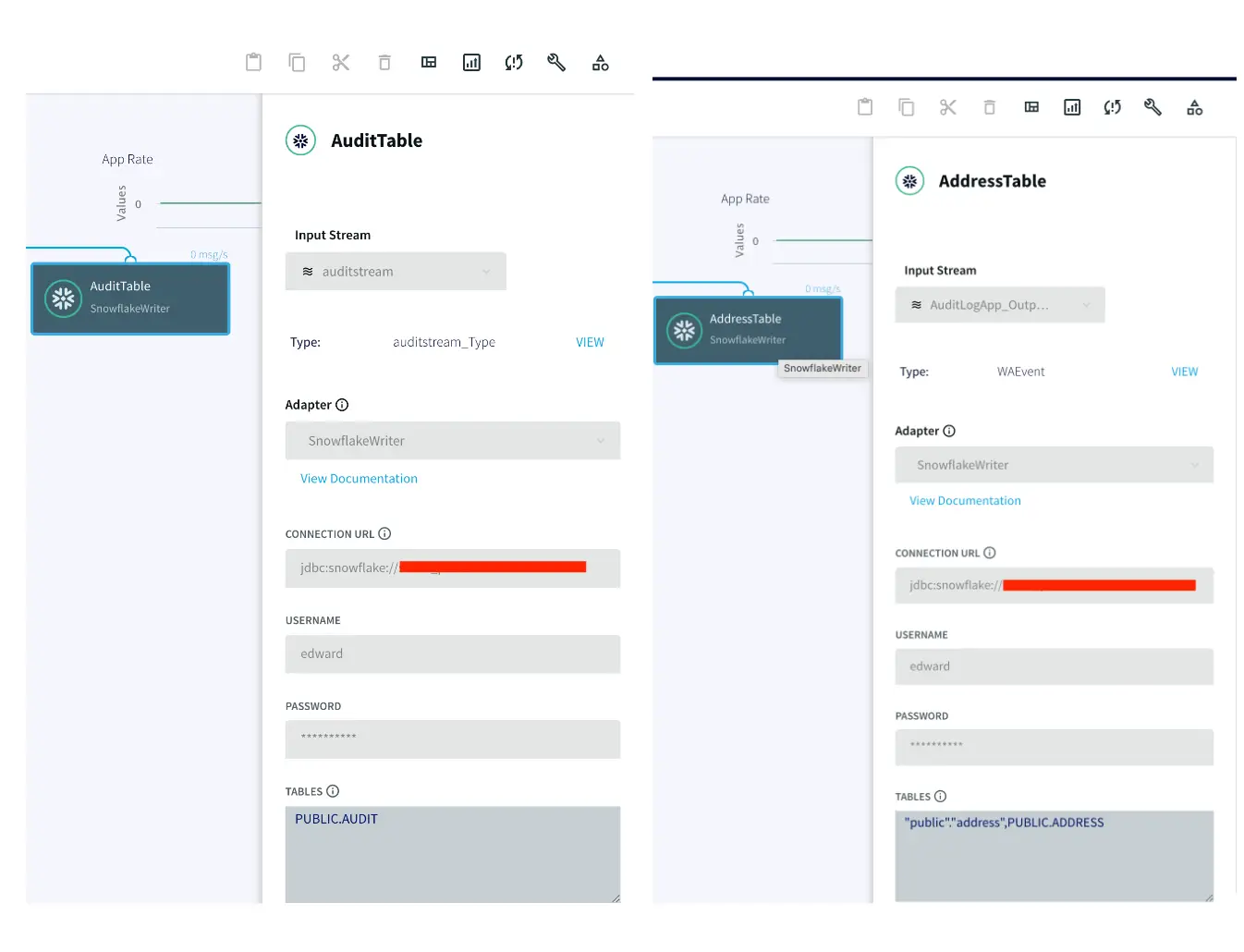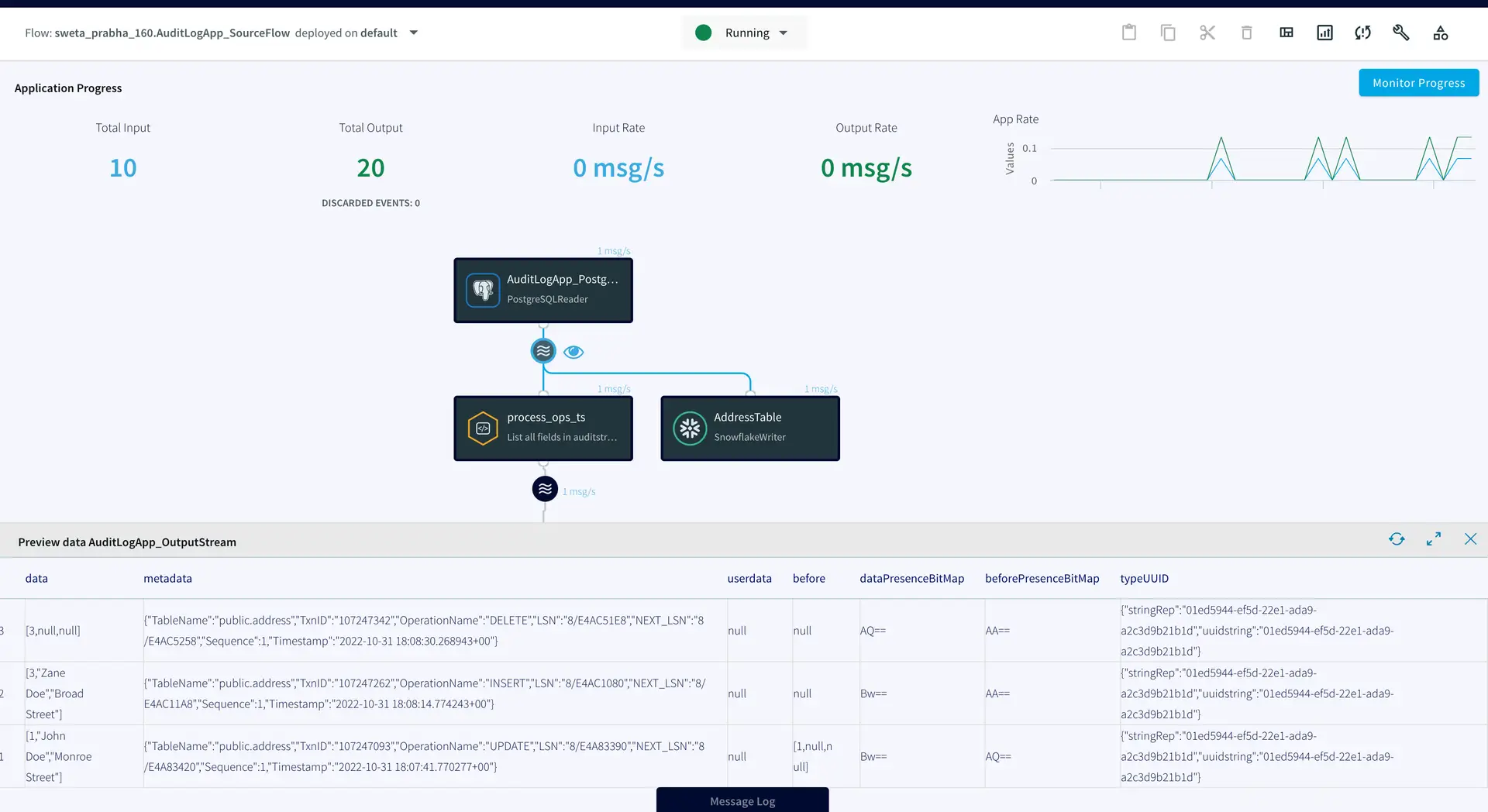 The target tables for this streaming application are hosted in snowflake data warehouse. There is an AUDIT table that stores all new as well as historical records for each customer and a second table called ADDRESS stores the most recent records for each customer.