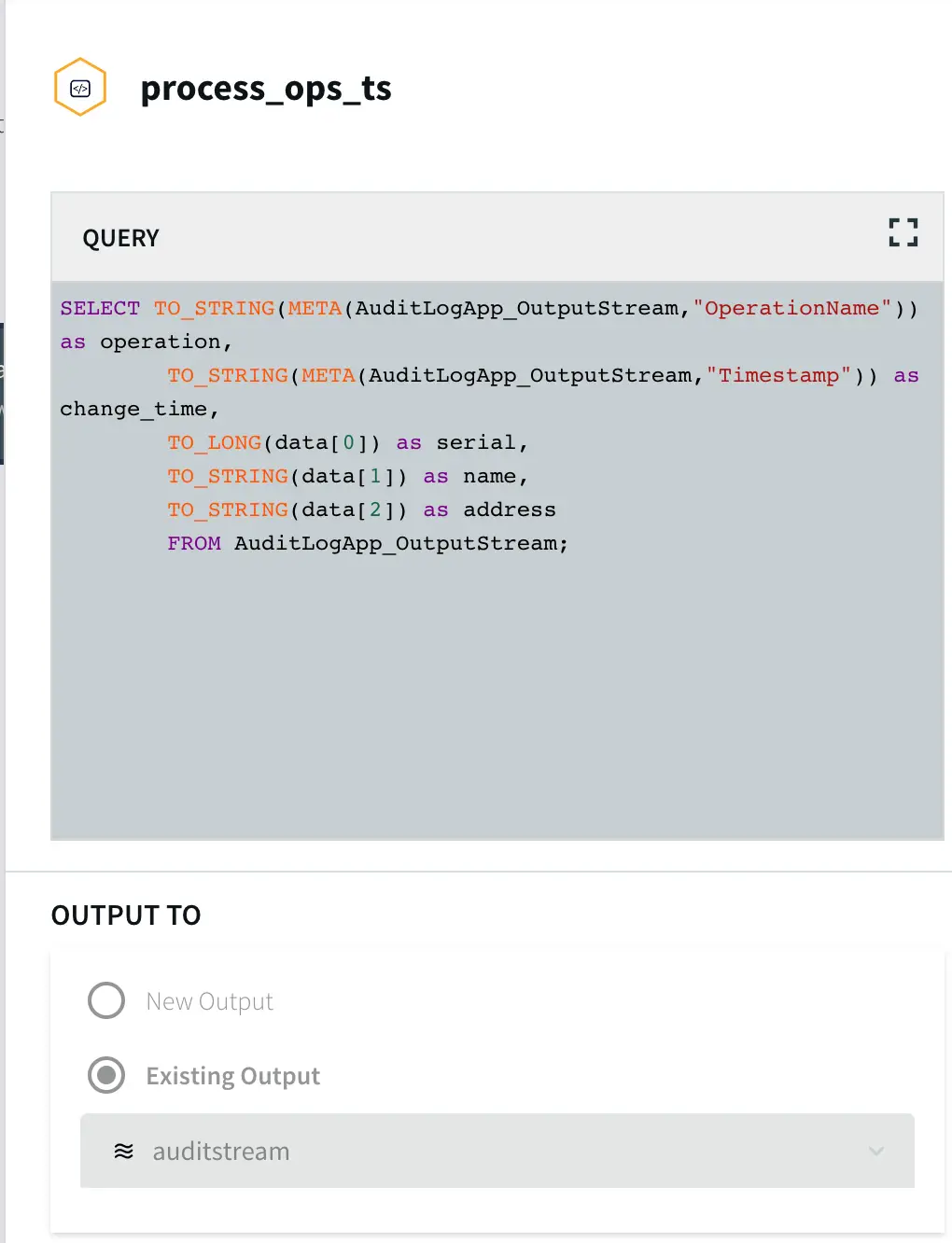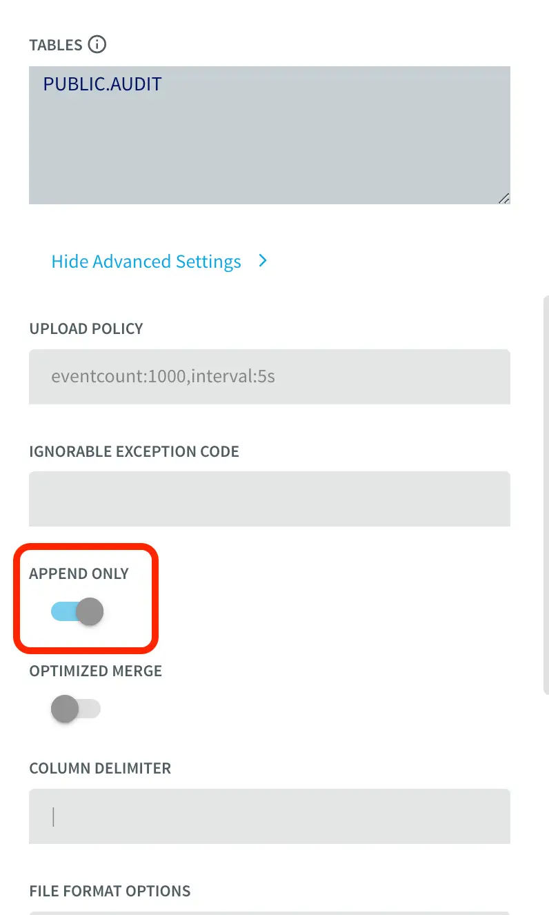 To insert data into AUDIT table, we process the input stream with a Continuous Query to include operation time and Timestamp when CDC occurred using the metadata. The APPEND ONLY setting is set to True that handles the updates and deletes as inserts in the target.