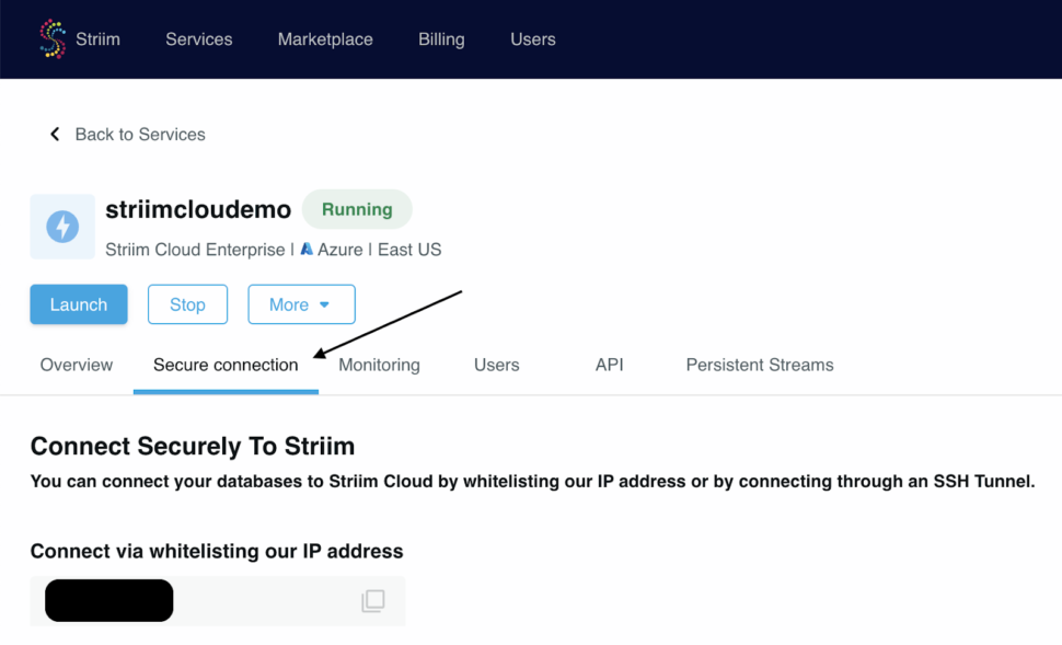 1. Once the Dedicated cluster is up and running, we would need to whitelist the IP for Striim Cloud which can be found under the Secure connection tab within the Striim cloud account.
