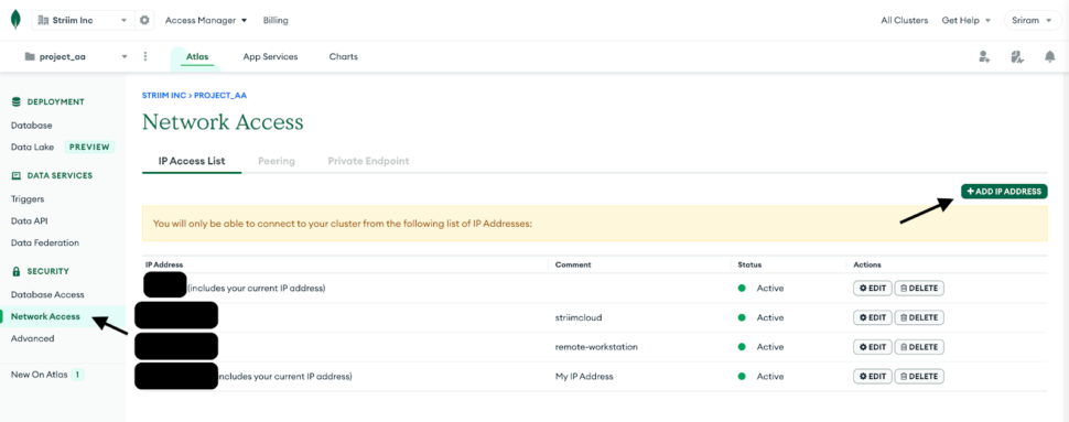 2. Navigate to Network Access under Security in the MongoDB account and whitelist the IP for any workstation that will be used along with the Striim App’s IP.