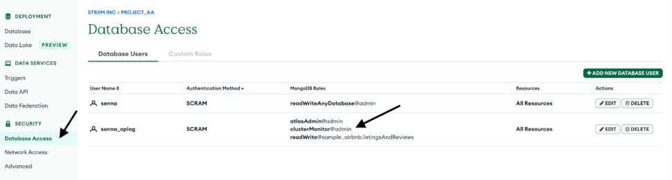 3. Create a database user for the cluster by navigating into the Database Access tab and make sure to add clusterMonitor role under the MongoDB roles. This is necessary for the Striim App to gain access to the OpLog and read the CDC data.