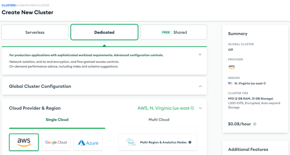 Note: There are multiple cluster offerings to choose from MongoDB which are as follows: Shared cluster, Dedicated Cluster, and Multi-Cloud & Multi-region cluster. We will be using a Dedicated cluster in this recipe since the shared free tier cluster uses a shared opLog, and for security concerns, external services or applications aren’t given access to it.