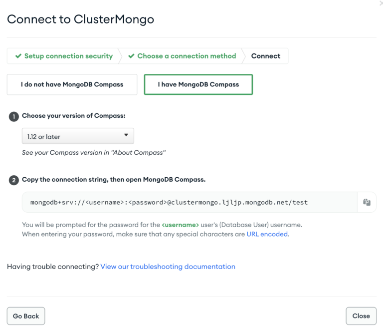 We can connect to the cluster using the mongosh or Mongo’s GUI tool called Compass.