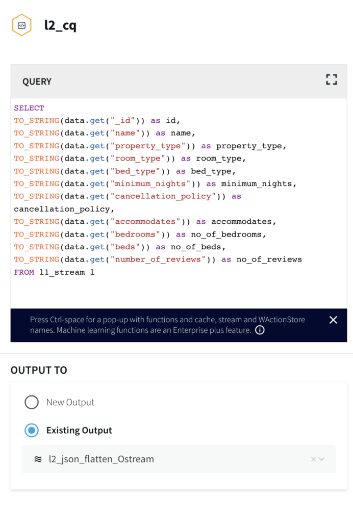 Select the Continuous Query (CQ) processor from the drop-down menu and pass the following query to pull MongoDB data from the dataset that has been created. The query can be found in the following GitHub repository.
