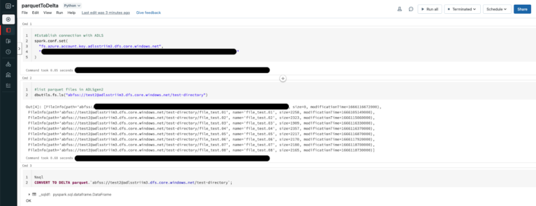 Databricks allows us to convert an existing parquet table to a Delta table in place and in this recipe, we will be pointing the Delta table to the ADLS storage container from above which receives the Parquet file dump.
