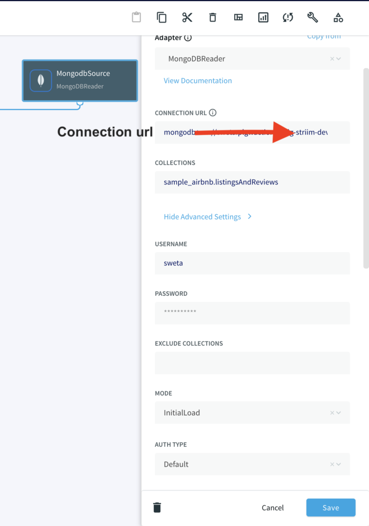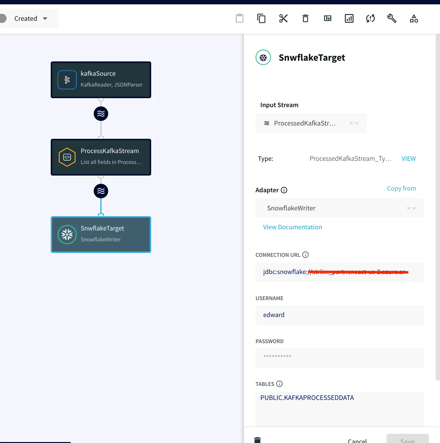 Drag the Snowflake component from the left panel and configure your target. The connection url is of the format