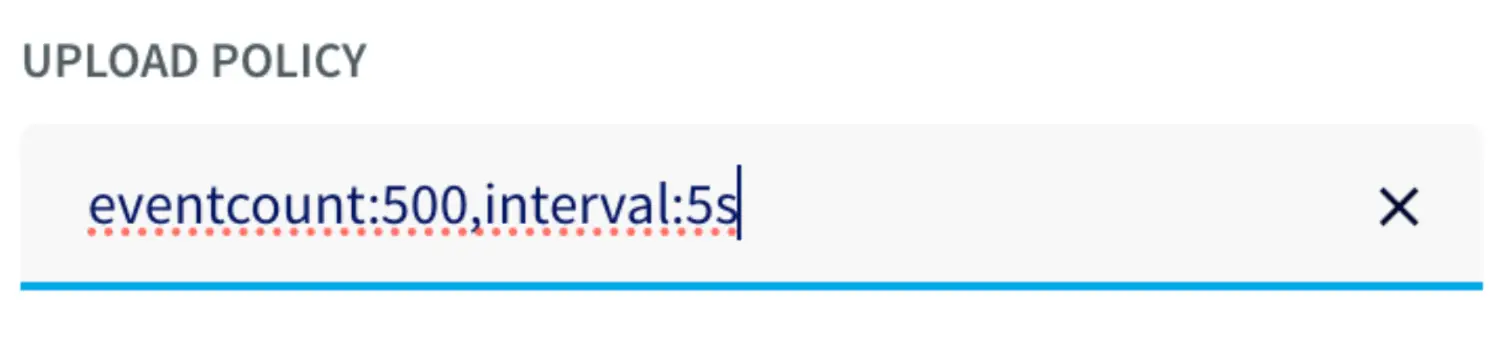 You can fine-tune the settings of upload policies based on the needs of your users. But you may start by changing ‘UploadPolicy’ to ‘eventcount:500,interval:5s’ to load either at every 500 events or 5 seconds (whichever comes first).