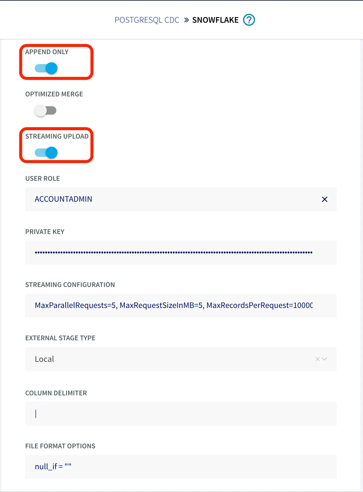 To configure the snowflake writer, under Advanced Settings, enable APPEND ONLY and STREAMING UPLOAD. With this setting, data will be streamed to the target table directly. Enter your user role and private key as shown below.