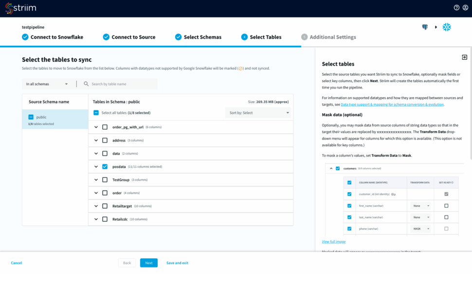 The service then checks for the compatibility of the source schema with Databricks and presents the table list for your selection. While selecting your tables, you can also choose the transformation per table that will be applied as the data flows through the pipeline in real time. For this demo, let’s choose to mask this specific column’s data.
