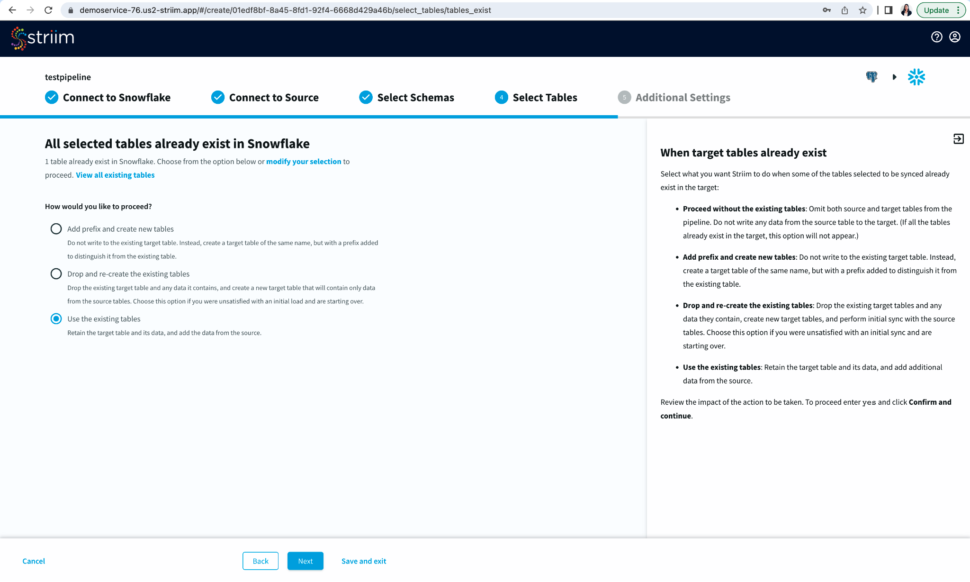Striim will now check the target warehouse and give you the option to sync with existing tables or create a new table.