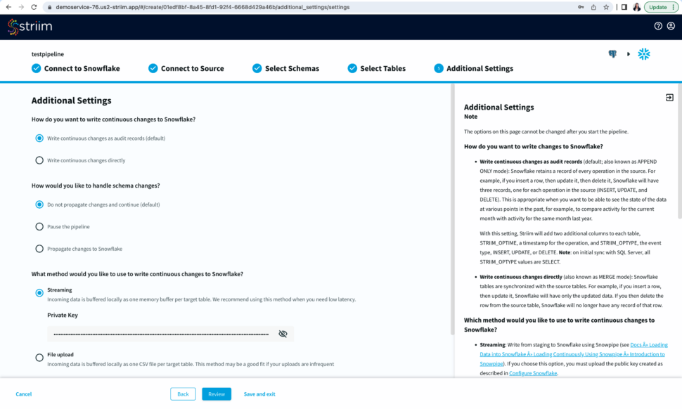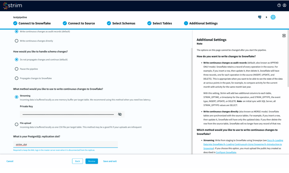 You have options to write changes as audit records or directly to your target table. You can specify how you want to handle schema changes. For streaming option, enter the private key associated to the public key of your Snowflake user id.