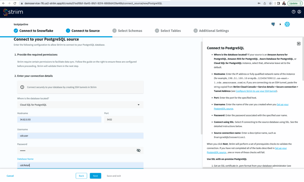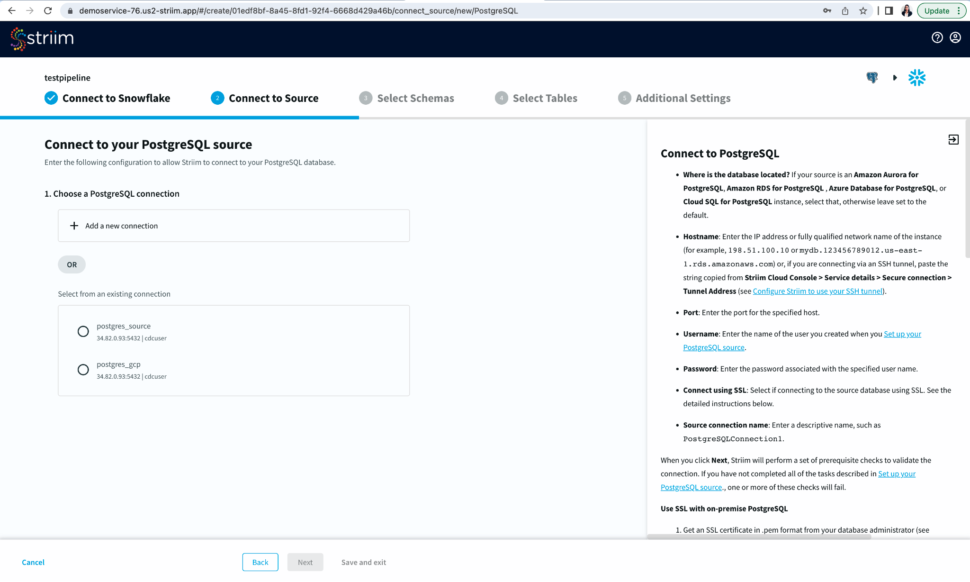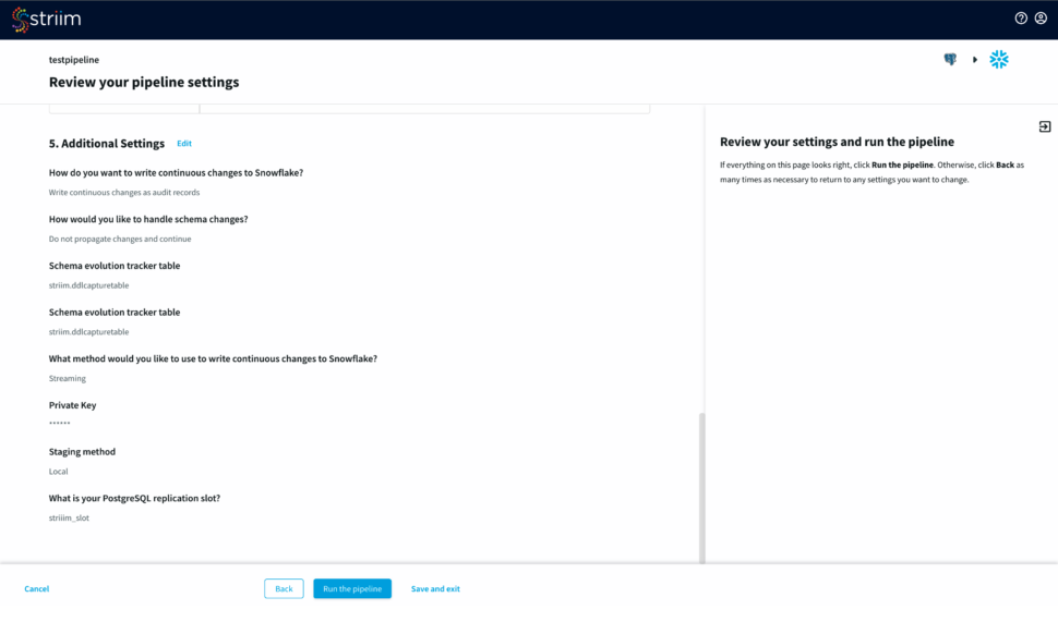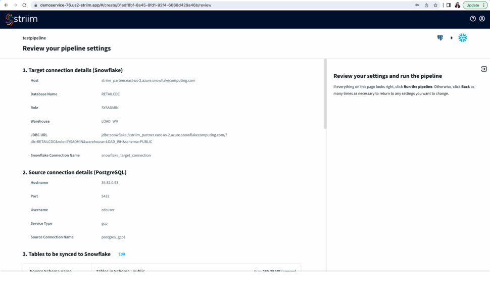 Review your source and target connection before running the pipeline. Make sure that your source and target connection details, selected tables and additional settings are correct.