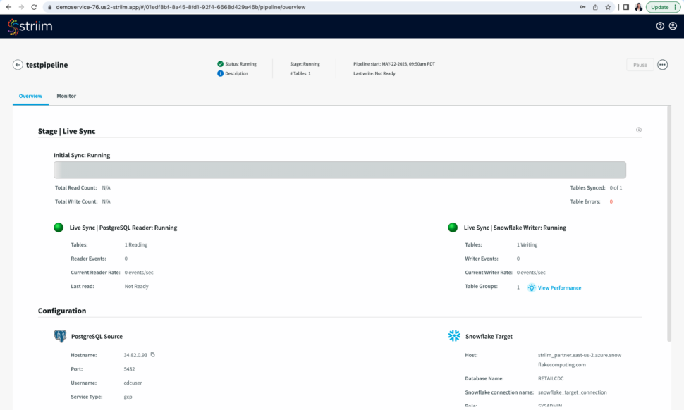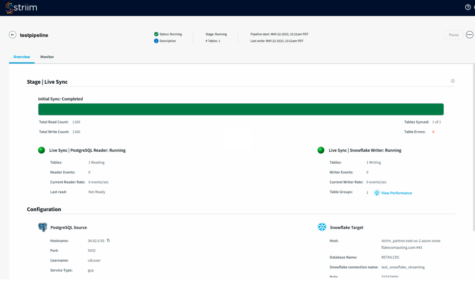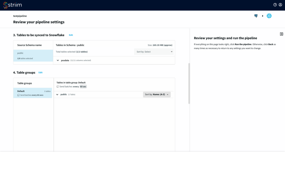 After you have reviewed your pipeline, run your pipeline to sync the table from your source with the target followed by data streaming.