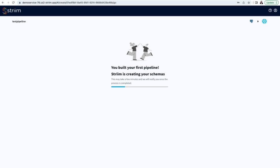 A summary is shown in case you choose to make modifications before running the pipeline. In this demo, we reviewed it and started the first pipeline. As you can see, within a few seconds the pipeline was created and started to move the initial load automatically.