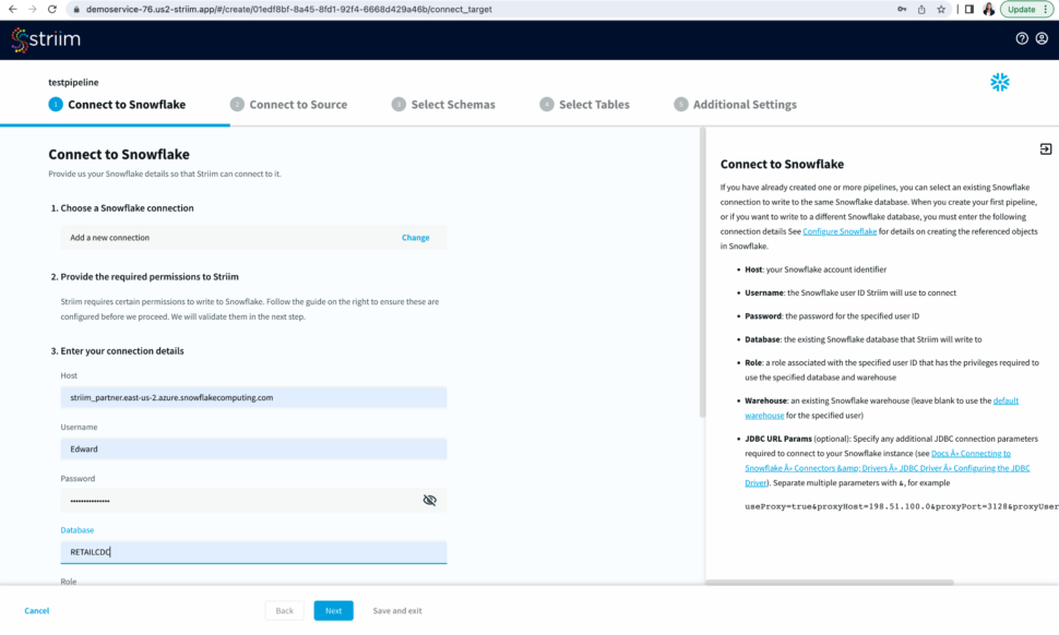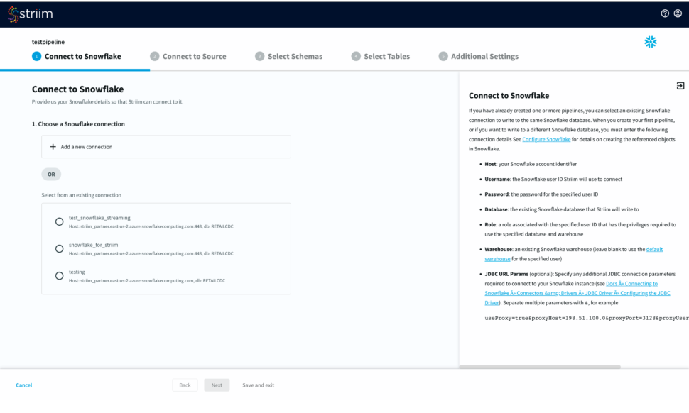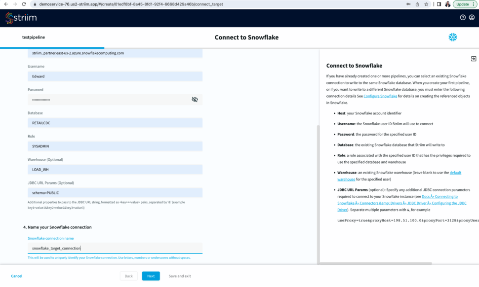 Name your snowflake connection. Striim saves these connection details under the connection name for future use.