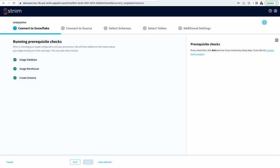 After you have entered your connection details, click Next. Striim will check if all the prerequisites have been met.