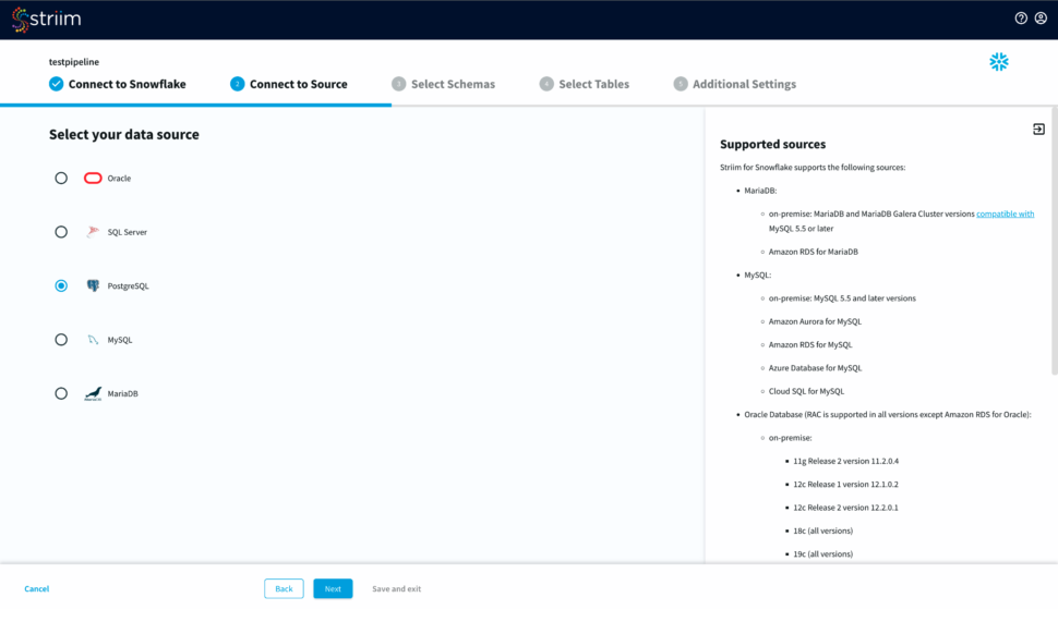 Once your target connection is verified, configure your source connection by selecting your source database. Here, we have selected postgreSQL as our data source.