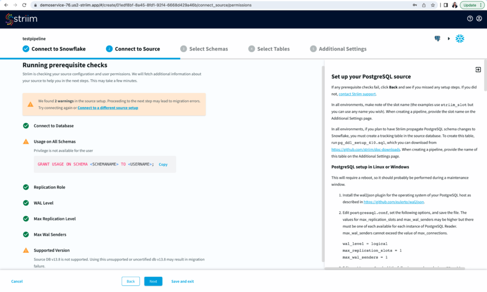 Now Striim will run prerequisite checks to verify source configuration and user permissions.