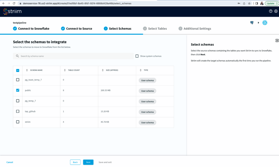 Select the source schemas containing the tables you want to sync with Snowflake.