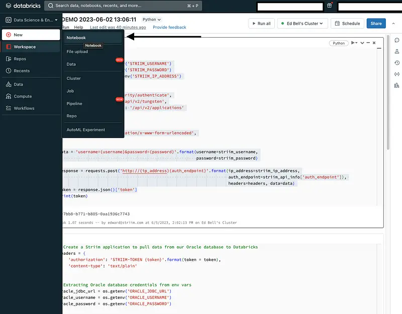 With the authentication token in hand, you will use Python and the Striim REST API to create a Striim application. This application will serve as the bridge between the Oracle database and Databricks.